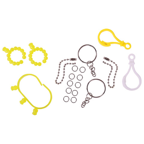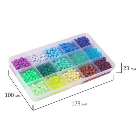 В набор входят бусины 30 различных цветов, около 100 штук каждого цвета, 2 пластиковых контейнера с отсеками для удобного хранения бусин, 3 подставки-трафарета, 14 двусторонних карточек с картинками, бутылочка-пульверизатор для воды, специальная ручка для аквамозаики, лопатка для снятия готовой фигурки с трафарета, а также основы для браслета и других украшений, колечки и крепления для создания брелков, подвесок и других игрушек из бусин. Диаметр одной бусины - 0,5 см.