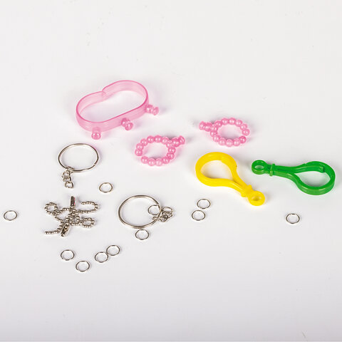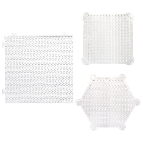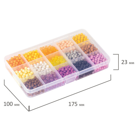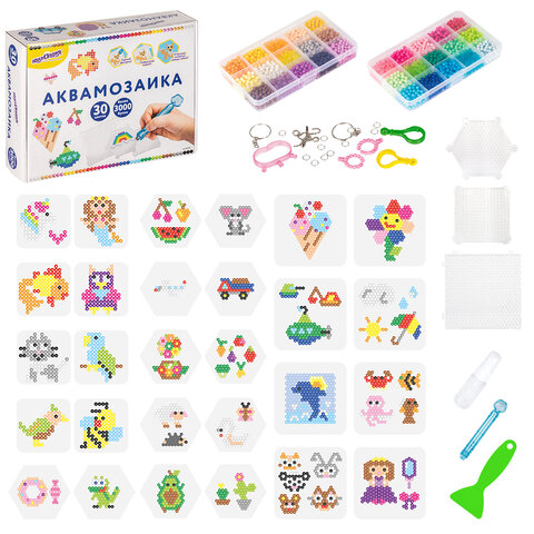 В набор входят бусины 30 различных цветов, около 100 штук каждого цвета, 2 пластиковых контейнера с отсеками для удобного хранения бусин, 3 подставки-трафарета, 14 двусторонних карточек с картинками, бутылочка-пульверизатор для воды, специальная ручка для аквамозаики, лопатка для снятия готовой фигурки с трафарета, а также основы для браслета и других украшений, колечки и крепления для создания брелков, подвесок и других игрушек из бусин.