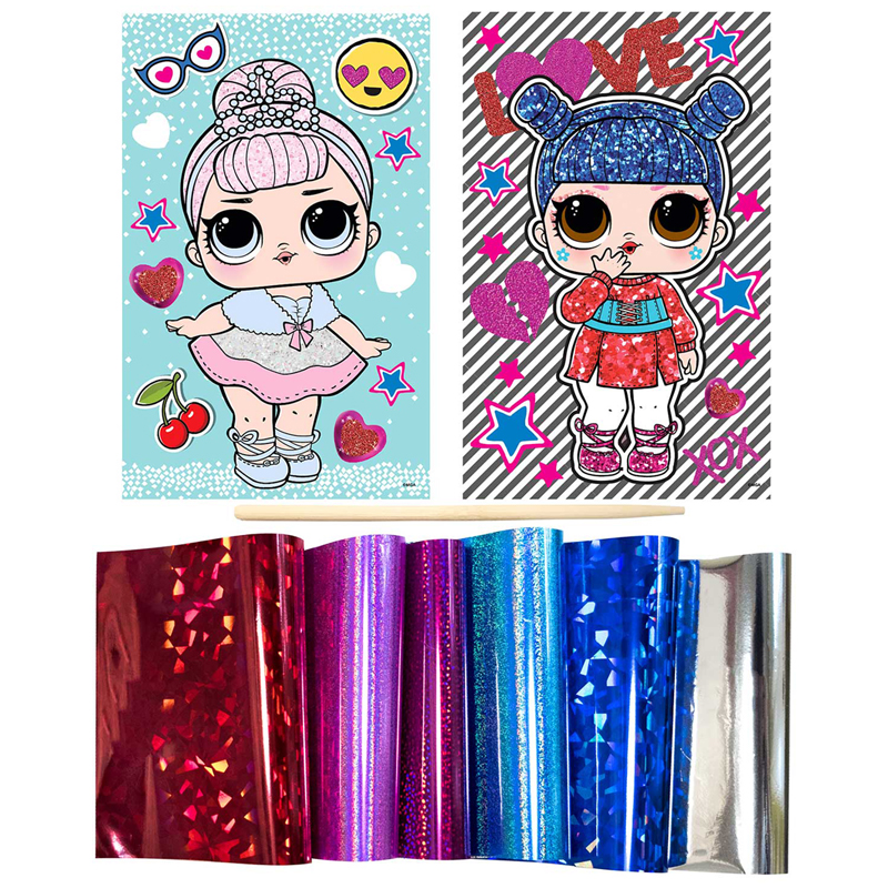 аппликация из фольги LOL - прекрасное средство развития воображения, аккуратности и терпения у ребенка, а также мелкой моторики, внимания и мышления. Собери всех L.O.L. Surprise из коллекции Foil Art. Нанеси цветную фольгу на прически, одежду и аксессуары - любимые героини засияют. Комплектация: 2 картинки с клеевой основой (11*17 см), 6 листов разноцветной фольги, стилус.