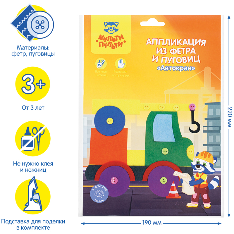 Аппликация из фетра и пуговиц «Мульти-Пульти» «Автокран» – прекрасное средство развития воображения, аккуратности и терпения у ребенка, а также мелкой моторики, внимания и мышления. С её помощью можно создать доступную и интересную поделку и провести время с пользой. Она предназначена для детей старше трёх лет. Все элементы на самоклеящейся основе, поэтому дополнительно не понадобится ни клей, ни ножницы! <br/>В наборе предусмотрены: цветная картонная основа, самоклеящиеся фетр, пуговицы и глазки, картонная подставка. Аппликация станет отличным дополнением детской комнаты, её также можно подарить в качестве подарка. <br/>• Вид товара: набор для аппликации;<br/>• Тип аппликации: аппликация из фетра и пуговиц;<br/>• Размер: 19*22 см;<br/>• Материал для аппликации: пуговицы, фетр, стразы, EVA;<br/>основа: картон;<br/>• Пол: универсальный;<br/>• Возраст: от 3 лет.