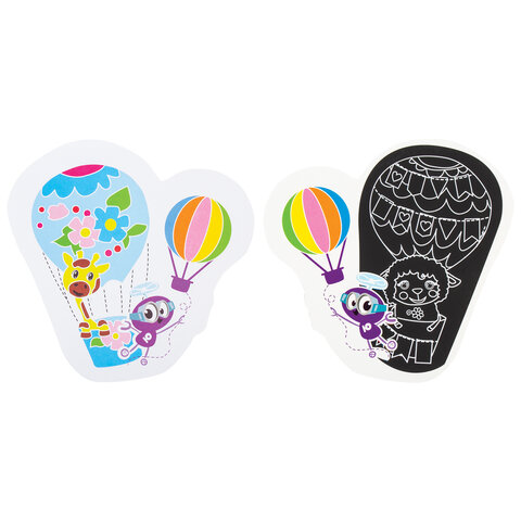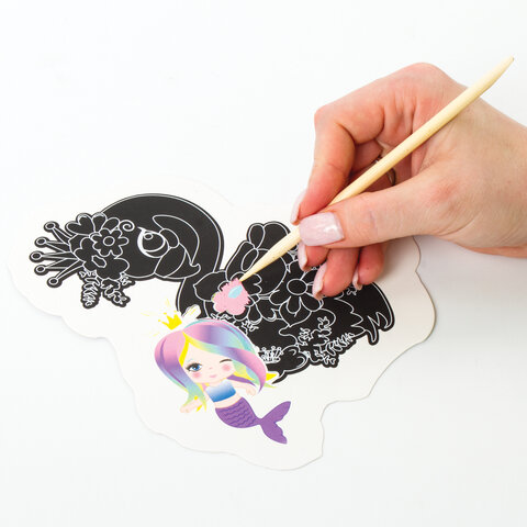 С другой стороны каждой картонной основы находится гравюра. При помощи той же деревянной палочки необходимо снимать чёрный слой чернил, в результате чего откроется яркий цветной рисунок.