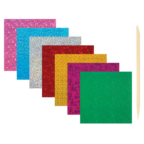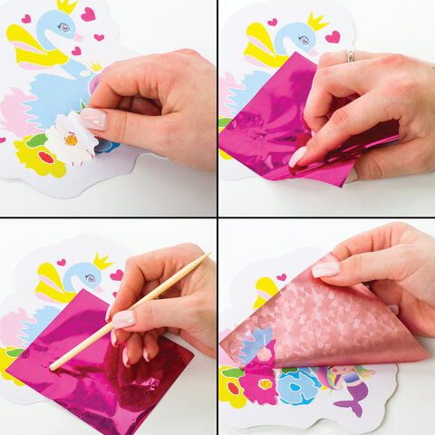 С одной стороны картонная основа содержит клеевой слой, покрытый слоем защитной бумаги с перфорацией. При помощи деревянной палочки, входящей в комплект, необходимо снять с элементов рисунка защитный слой бумаги и к показавшемуся клеевому слою приложить лист фольги цветной стороной вверх, тщательно разгладив всю поверхность элемента деревянной палочкой. При снятии фольги цветной слой остаётся на картонной основе, окрашивая её таким образом в блестящие цвета.