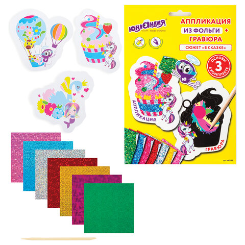 В набор входят 3 фигурных основы размером не более 20х15 см с различными картинками, каждая из которых содержит гравюру и аппликацию из фольги, а также 14 листов волшебной фольги (плёнки ПЭТ) 7 разных цветов, по 2 листа каждого цвета, и деревянная палочка. Дизайны аппликаций разработаны дизайнерами ЮНЛАНДИЯ специально для детей.