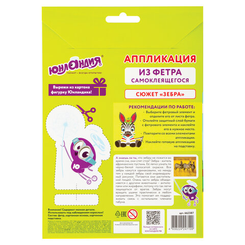 В набор входит яркая картонная основа в форме зебры размером не более 20х15 см с напечатанным дизайном аппликации, разработанным дизайнерами ЮНЛАНДИЯ специально для детей, а также 8 листов фетра разных цветов. Фетровые элементы аппликации перфорированы и имеют клеевой слой, что позволяет создать аппликацию без клея и ножниц. Также в набор входит картонная подставка с клеевым слоем, на которую можно установить готовую аппликацию.