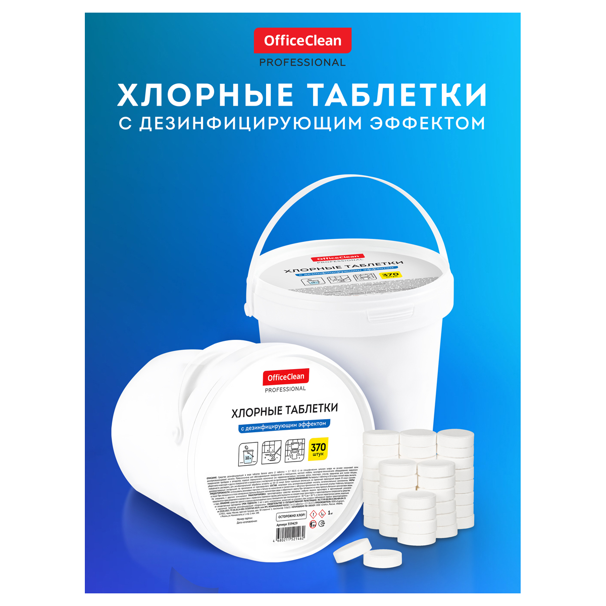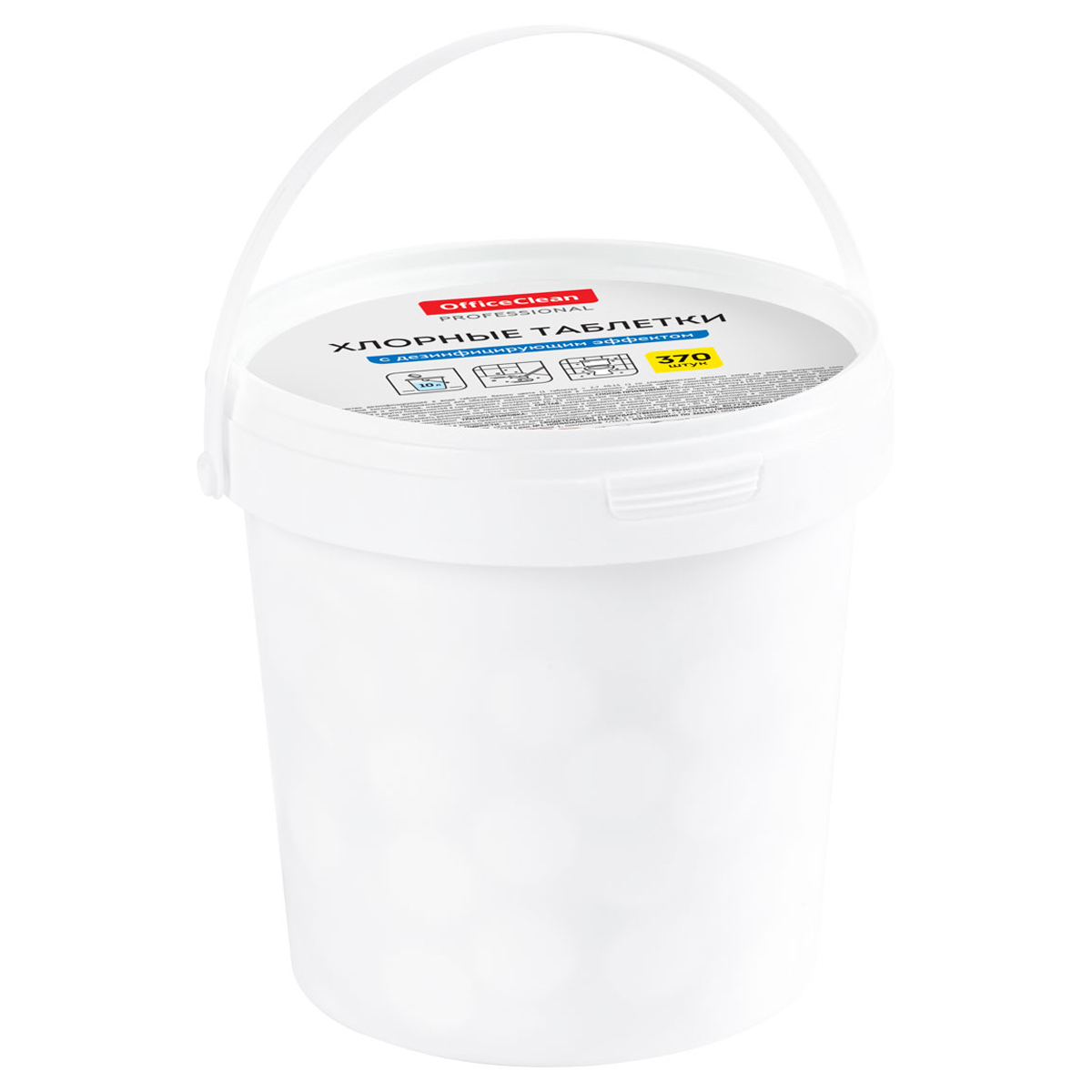 Хлорные таблетки OfficeClean Professional с дезинфицирующим эффектом – отличное решение для уборки. Таблетки упакованы в пластиковое ведро в количестве 370 штук. Вес – 2,7 ± 0,15 г.<br/>Таблетки предназначены для ежедневного и периодического мытья, очистки и антибактериальной обработки всех типов водостойких моющихся поверхностей. Отлично подойдут для уборки в производственных, офисных, складских, кухонных, гигиенических и других помещениях организаций общественного питания (кафе, барах, ресторанах, столовых), торговых и деловых центров, медицинских, образовательных и иных учреждений, спортивно-оздоровительных и культурно-досуговых сооружений, предприятий промышленности, гостиниц и вокзалов, на всех видах транспорта (корпусов и двигателей и пр.), местах общего пользования и в быту. Температурный интервал режима хранения и транспортировки – от -30 до +30 °C.<br/>• Количество таблеток: 370;<br/>• Упаковка: пластиковое ведро;<br/>• Обрабатываемая поверхность: любая.