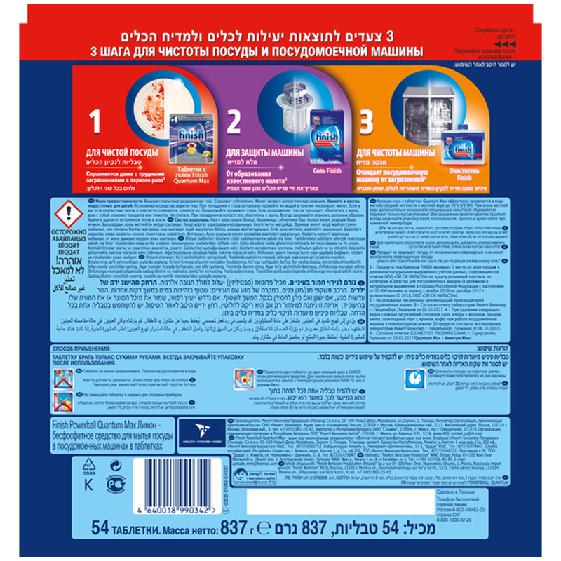Удаляет даже пригоревшую пищу и сложные загрязнения с первого раза. Особенность 4:Finish игрок No1категории средств для посудомоечной машины, существующий с середины 1950-х гг. Finish рекомендован ведущими производителями посудомоечных машин: Bosch, Siemens, Beko, Gorenje. Finish имеет широкий ассортимент средств на рынке практически на любой кошелек. В линейке представлены чистящий средства: таблетки премиального сегмента Quantum Max, таблетки среднего ценового сегмента All in One Max, таблетки экономичного сегмента Classic, гели All in One и Порошки Classic, а также добавки к чистящим средствами для обеспечения наилучших результатов мытья посуды: соль, ополаскиватель, очиститель, освежитель. Особенность 5:Продукты под брендом FINISH занимают 1 место по доле продаж в денежном/натуральном выражении с учётом данных, содержащихся в отчетах ООО ЭЙ СИ НИЛЬСЕН по аудиту розничной торговли по категории Средства для посудомоечных машин (в денежном и натуральном выражении) в городах Российской Федерации с населением от 10 000 человек за период с ноябрь 2016 по декабрь 2017 г. включительно ( 2018, ООО ЭЙ СИ НИЛЬСЕН). На основании письменных рекомендаций производителей посудомоечных машин. Согласно отчету Рекитт Бенкизер, г. Гейдельберг, Германия, 08.10.2017 При удалении следующих видов сложных загрязнений (топленое сало, хлопья с молоком, лазанья, омлет, шоколадный торт с кремом, кофе) при работе посудомоечной машины в температурном режиме 55 градусов (согласно исследованию лаборатории Рекитт Бенкизер г. Гейдельберг, Германия от 08.10.2017). При работе посудомоечной машины в температурном режиме от 49С до 60 С. На основании отчета Рекитт Бенкизер, г. Гейдельберг, Германия, 08.10.2017. Finish, Quantum, Powerball зарегистрированные товарные знаки Finish. Max - Макс. Форма продукта: