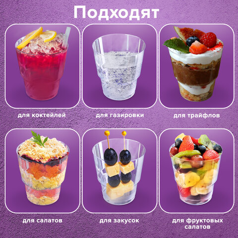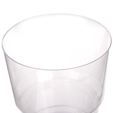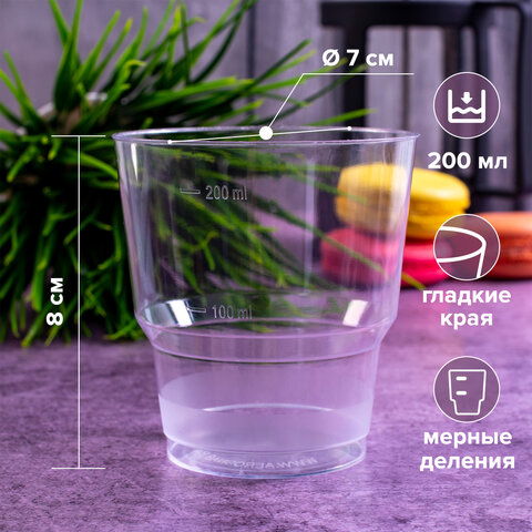Прозрачные стаканы объемом 200 мл предназначены для холодных, горячих (до +70°C) напитков. Диаметр - 71 мм. Поставляются комплектом по 50 штук.