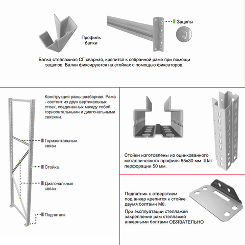 Конструкция стеллажа MS PRO представляет собой вертикальные стойки (рамы), на которые устанавливаются горизонтальные ярусы (полки). В свою очередь, ярус стеллажа формируется двумя продольными и двумя поперечными балками фигурного сечения, на которые укладываются наборные полки из оцинкованного металла. Крепление балки к стойкам безболтовое, на зацепах, с дополнительной фиксацией, предохраняющей балку от случайного подъема. Ярусы могут переставляться по высоте с шагом 50 мм, без демонтажа всего стеллажа. Нагрузка на каждый ярус - до 500 кг, в зависимости от ширины самого яруса.