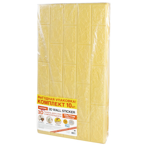 Стеновые панели ПВХ поставляются в листах размером 70х77 см, в выгодной упаковке по 10 листов. 3D панели для стен изготовлены в виде декоративной рельефной кирпичной кладки цвета слоновой кости и подойдут для любого интерьера. Самоклеящиеся панели можно наклеить в прихожей, в детской, на балконе, в ванной. Это не только удобное, но и выгодное решение для кухонного фартука. Гибкие настенные панели для ремонта изготовлены из безопасного вспененного полиэтилена толщиной 5 мм и обеспечивают дополнительную звукоизоляцию. Специальное покрытие лицевой стороны из полиэтиленовой плёнки способствует лёгкому уходу – панели для стен не боятся влаги, пятен или пыли и легко отмываются. Слой акрилового клея, нанесённый с обратной стороны панели, позволяет с лёгкостью наклеить интерьерные наклейки на любую ровную поверхность – на бетон, гипсокартон, пластик, дерево, стекло или металл. С помощью обычных ножниц мягкие панели для стен можно нарезать на отдельные кирпичики или любые фрагменты требуемого размера и формы. Можно использовать в качестве потолочных панелей. Монтаж самоклеящихся панелей для стен легко выполнить собственными руками. Потребуется лишь фантазия для того, чтобы легко преобразить интерьер, привнести уют или создать свой собственный неповторимый дизайн.