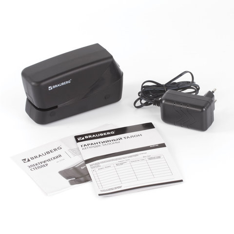 Модель с электрическим механизмом выполнена в черном пластиковом корпусе и способна сшить до 20 листов. Степлер оснащен противоскользящими резиновыми накладками в основании. Отсек фронтальной загрузки выдвигается при нажатии кнопки. Питание осуществляется от AC/DC- адаптера (входит в комплект) или 4-х батареек типа АА (не входят в комплект).