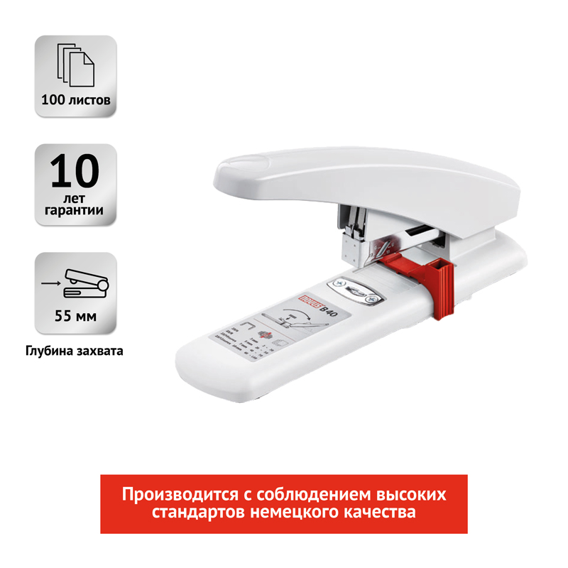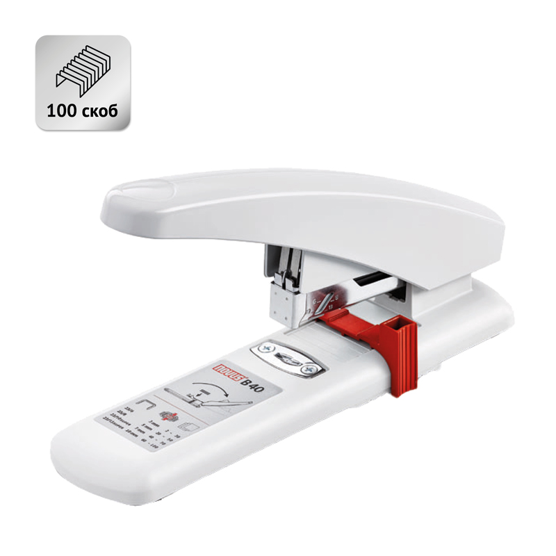 Мощный степлер со стильным дизайном имеет антиблокировочную систему (ABS) для безукоризненного сшивания и верхний загрузочный механизм с двойной пружинной направляющей скоб. Вмещает до 100 скоб № 23/6-23/13. Глубина захвата – 55 мм. Сшивает до 100 листов плотностью 80 г/кв. м. Механизм скрепления выполнен из прочного металла, а корпус из высококачественного пластика.