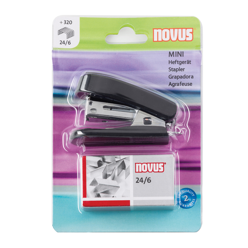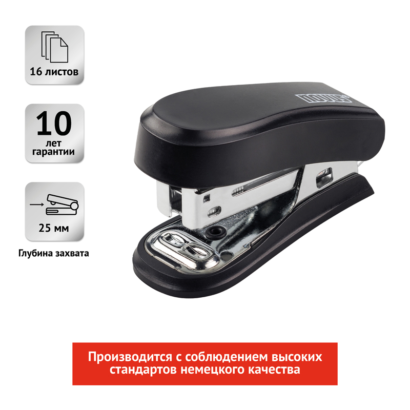 Компактный и надежный степлер чёрного цвета имеет встроенный металлический антистеплер и скрепляет до 16 листов. Вмещает до 45 скоб № №24. Глубина захвата – 25 мм. Механизм скрепления выполнен из прочного металла, а корпус – из высококачественного пластика, что гарантирует долгий срок службы. <br/>В набор входят скобы 24/6 320 шт.<br/><br/>Степлеры Novus гарантируют идеальный результат. Производятся в современном дизайне из высококачественных материалов, с соблюдением высоких стандартов немецкого качества. Гарантия 10 лет.<br/><br/>• Номер скобы: 24;<br/>• Глубина захвата: 25 мм;<br/>• Количество скрепляемых листов: 16;<br/>• Материал корпуса: пластик.