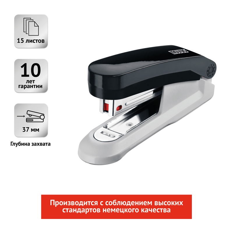 Удобный степлер для использования в офисе и дома. Имеет встроенный антистеплер, сшивает до 15 листов. Номер скобы: 10. Глубина захвата – 37 мм. Механизм скрепления выполнен из прочного металла, а корпус из высококачественного пластика. Глянцевый чёрный цвет гармонично впишется в рабочее пространство. В комплект входит 200 скоб №10. <br/><br/>Степлеры Novus гарантируют идеальный результат. Производятся в современном дизайне из высококачественных материалов, с соблюдением высоких стандартов немецкого качества. Гарантия 10 лет.<br/><br/>• Номер скобы: 10;<br/>• Глубина захвата: 37 мм;<br/>• Количество скрепляемых листов: 15;<br/>• Материал корпуса: пластик.