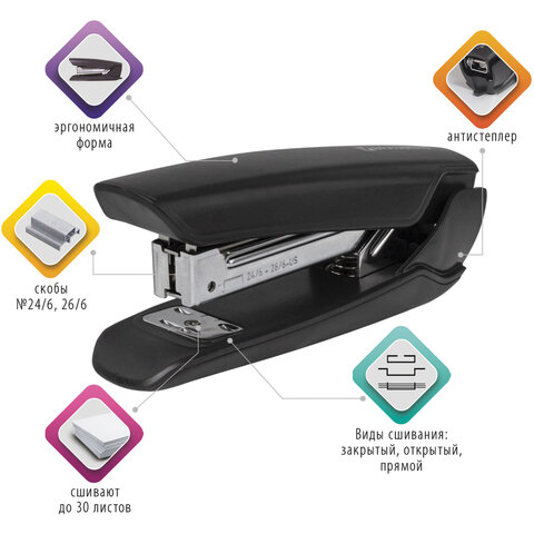 Степлер №24/6, 26/6 BRAUBERG "SUPER", до 30 листов, черный, 272739