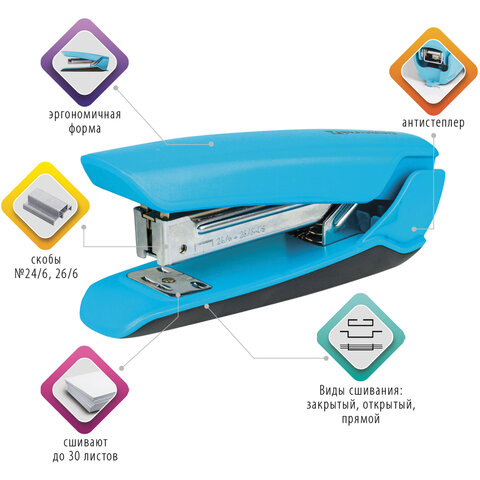 Степлер №10 BRAUBERG "ADVANCED", до 15 листов, с антистеплером, голубой, 228747