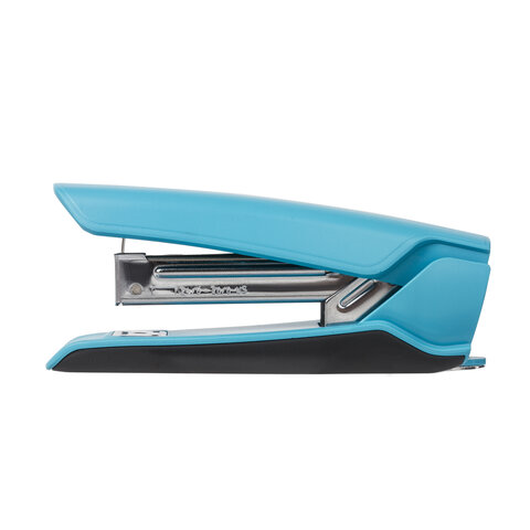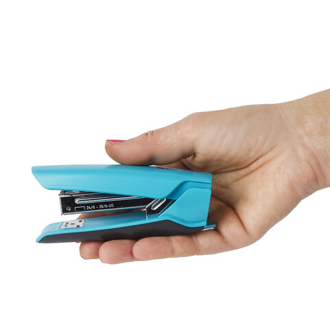 Степлер №24/6, 26/6 BRAUBERG "ULTRA" в голубом пластиковом корпусе с металлическим механизмом способен скрепить до 30 листов. Подходящий размер скоб №24/6, 26/6. Виды сшивания: закрытый, открытый и прямой. Глубина закладки бумаги - 52 мм. Габариты: высота - 45 мм, ширина - 34 мм, длина - 115 мм. Благодаря компактным размерам удобен в использовании и занимает мало места на рабочем столе, а необычный современный дизайн украсит любой интерьер. Продается в картонной упаковке.