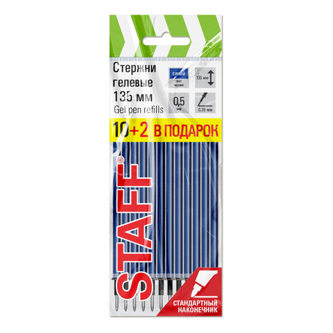 Стержни гелевые STAFF, 135мм, НАБОР 10шт+2шт в ПОДАРОК, СИНИЕ, игольчатый узел 0,5мм, 170412