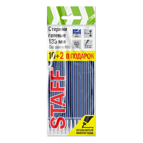 Стержни гелевые STAFF, 135мм, НАБОР 10шт+2 шт в ПОДАРОК,СИНИЕ, узел 0,5мм, линия 0,35мм,170410
