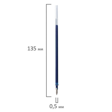 Длина стержня составляет 135 мм. Диаметр пишущего узла 0,5 мм создает тонкую линию письма, равную 0,35 мм. Имеет евронаконечник. Цвет чернил - синий.
