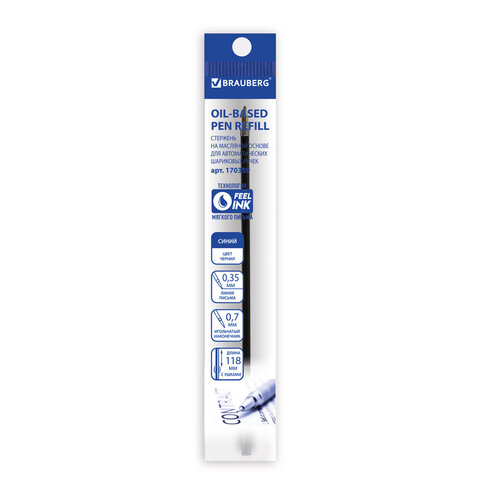 Стержень шариковый масляный BRAUBERG 135 мм, СИНИЙ, игольчатый узел 0,7 мм, линия письма 0,5 мм, 170401