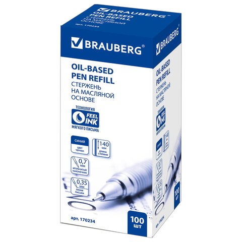 Стержень шариковый масляный BRAUBERG 140 мм, СИНИЙ, игольчатый узел 0,7 мм, линия письма 0,35 мм, 170402