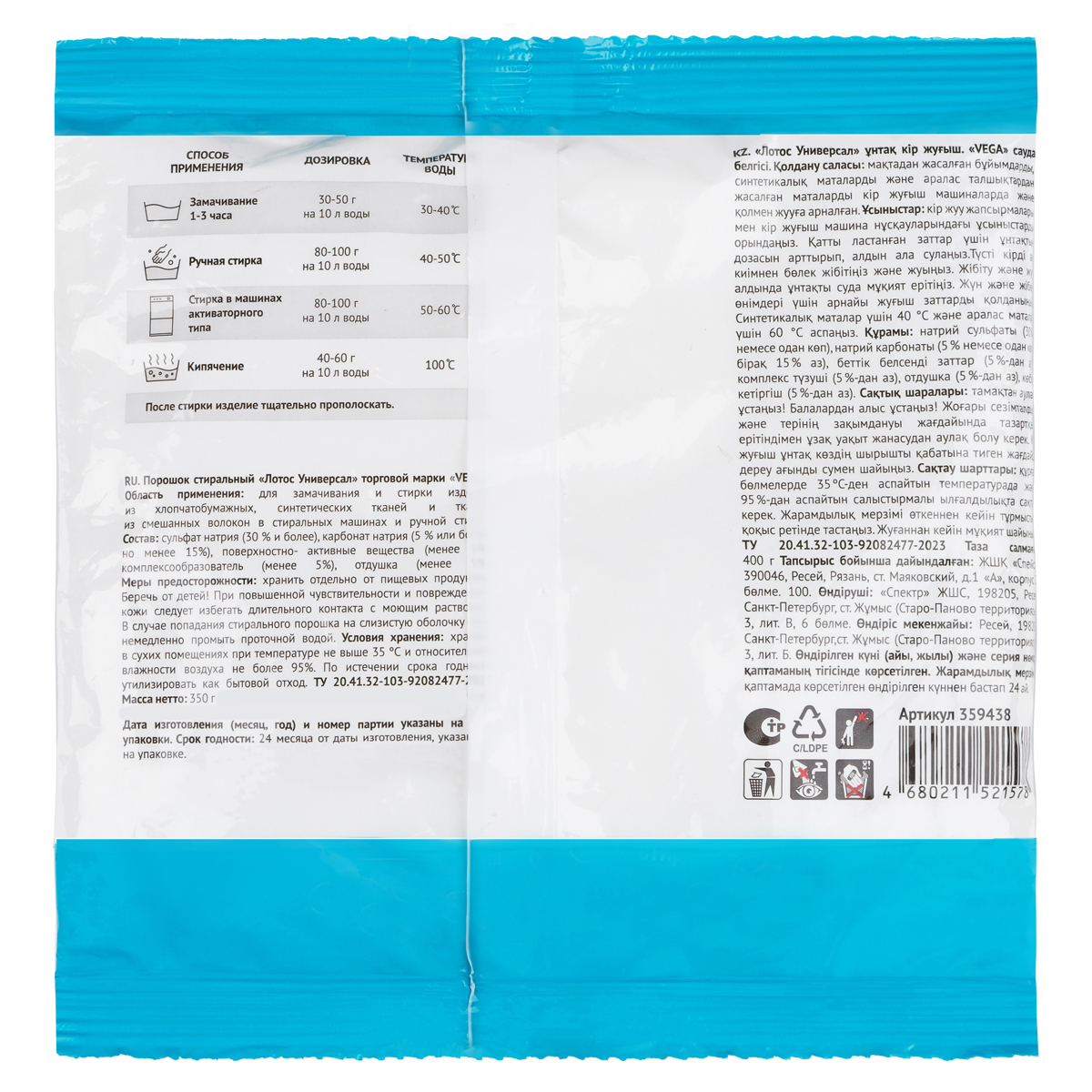 Порошок стиральный VEGA «Лотос Универсал» подходит для замачивания и стирки изделий из хлопчатобумажных, синтетических тканей и тканей из смешанных волокон в стиральных машинах активаторного типа и ручной стирки. Сохраняет цвет и бережно относится к тканям, сохранив волокна целыми и невредимыми. Эффективно удаляет загрязнения с волокон ткани. Средство быстро растворяется в воде и не остается на одежде. Экономичный расход. Легко справиться с любыми видами загрязнений. Масса нетто 350 граммов.<br/>Состав: сульфат натрия (30% и более), карбонат натрия (5 % или более, но менее 15 %), поверхностно-активные вещества (менее 5%), комплексообразователь (менее 5%), отдушка (менее 5%). <br/>ТУ 20.41.32-103-92082477-2023.<br/>• Тип: универсал;<br/>• Вес: 400 граммов.