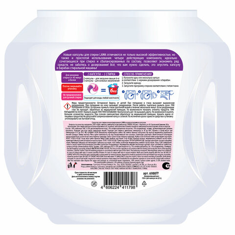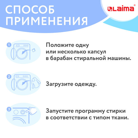 Капсулы подходят для стирки цветных изделий из хлопчатобумажных, льняных, синтетических тканей и тканей из смешанных волокон (кроме шелка и шерсти).