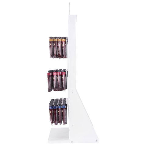 Высота стойки рассчитана на средний рост человека и то, что она будет располагаться на витрине. Любой покупатель с легкостью дотянется до нужной упаковки.