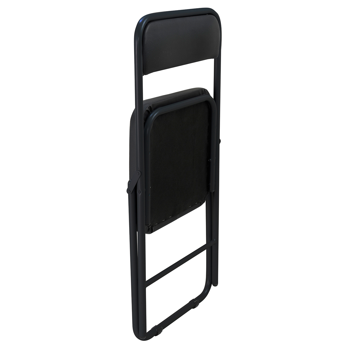 Одна из наиболее универсальных моделей для посетителей благодаря складной конструкции. Цвет обивки из экокожи – чёрный. Высота стула – 825 мм, ширина – 450 мм, максимальная нагрузка – 100 кг. Ширина спинки составляет 405 мм, а высота – 990 мм. Ширина сиденья – 395 мм, глубина – 495 мм.<br/>Мягкое основание стула с фанерным каркасом на крашеной металлической раме обеспечивает комфорт сидящего. Набивка – высокоупругий эластичный поролон. Каркас – устойчивая металлическая конструкция чёрного цвета. Стул подходит для офисных помещений, конференц-залов, учебных и медицинских учреждений, заведений общественного питания, гостиниц, или как компьютерный стул для дома. Поставляются по 4 штуки в картонной коробке.<br/>• Высота, мм: 825;<br/>• Глубина, мм: 495;<br/>• Ширина, мм: 450;<br/>• Ширина сиденья, мм: 395;<br/>• Высота до сиденья, мм: 500;<br/>• Высота спинки, мм: 990;<br/>• Материал обивки: экокожа;<br/>• Материал рамы: крашеный металл;<br/>• Цвет обивки: чёрный.