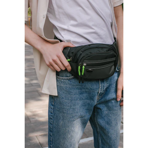 Сумка на пояс BRAUBERG RIO, карман, регулируемый ремень, черная, салатовые детали, 30х12x10 см, 270823