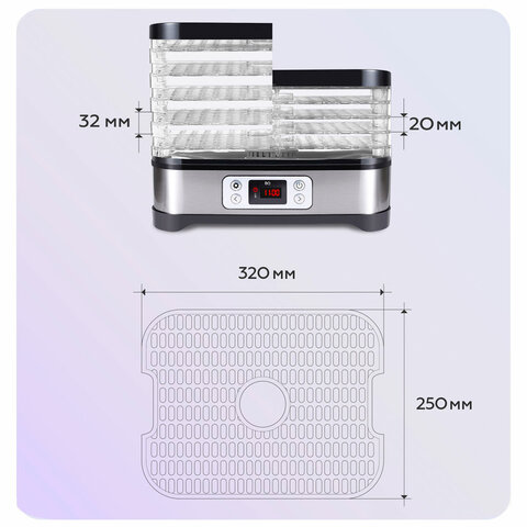 Сушилка (пищевой дегидратор) для овощей и фруктов BQ-FD1001, мощностью 250 Вт, имеет в комплектации 5 регулируемых по высоте поддонов. Корпус и поддоны дегидратора изготовлены из пищевого термостойкого пластика.