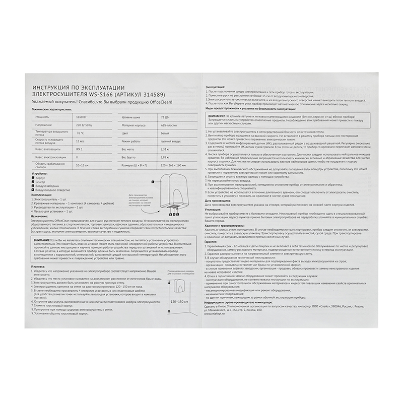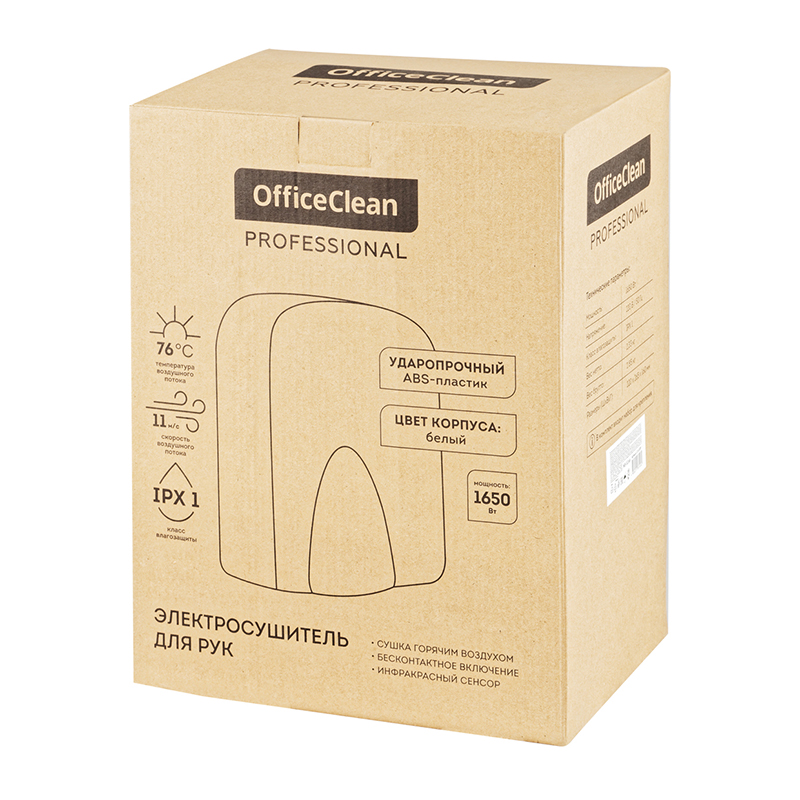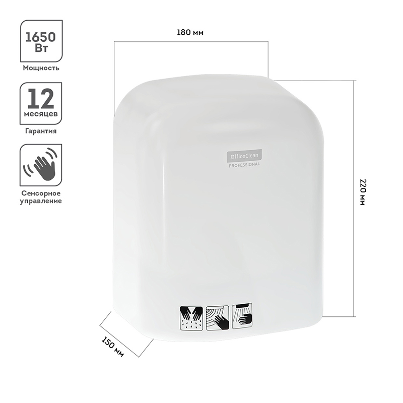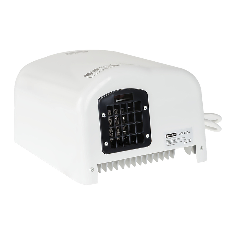 Сушилка для рук OfficeClean WS-S166, 1650 Вт, пластик, 220*150*180мм, белого цвета. Малошумная. Обладает высокой мощностью и классическим дизайном.