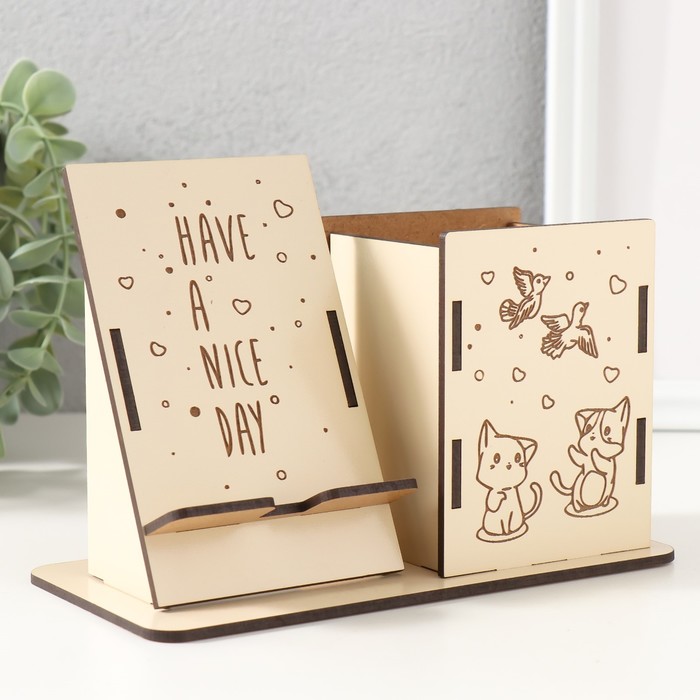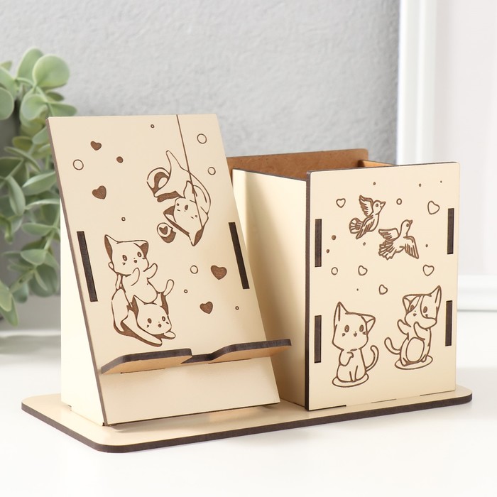 Деревянный органайзер настольный для канцелярии «Котики», набор 9 деталей, с подставкой под телефон, карандашница, 18×12.5×9 см
