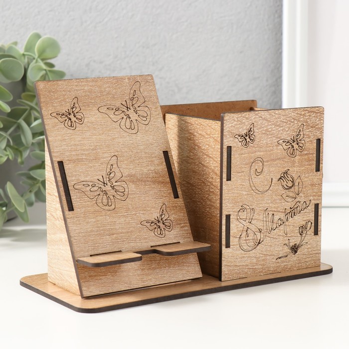 Деревянный органайзер настольный для канцелярии «Бабочки», набор 9 деталей, с подставкой под телефон, карандашница, 18×12.5×9 см