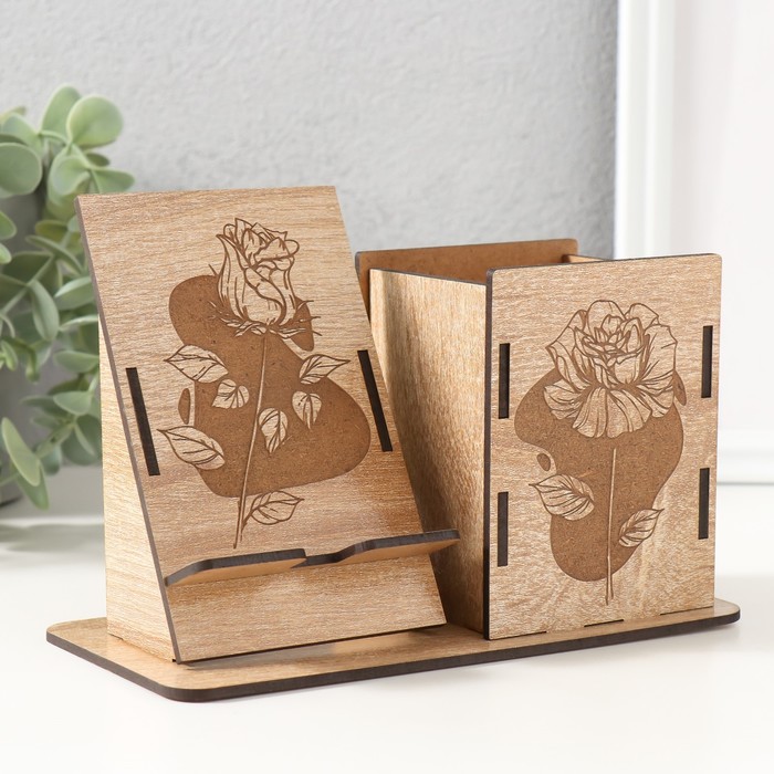 Деревянный органайзер настольный для канцелярии «Лилии», набор 9 деталей, с подставкой под телефон, карандашница, 18×12.5×9 см