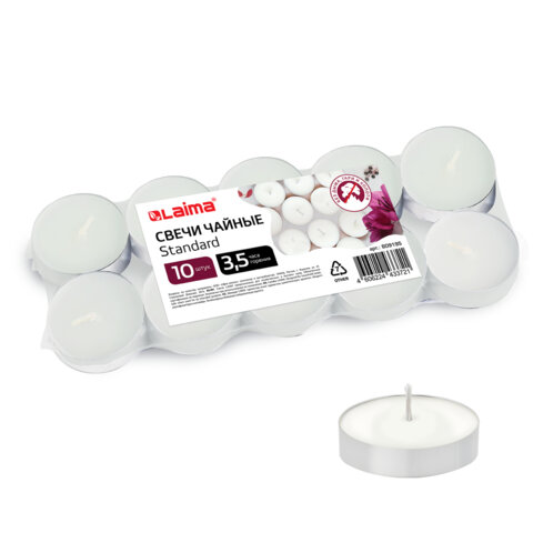 Свечи чайные Standard, до 3,5 часов горения, вес 8,5 г, КОМПЛЕКТ 10 шт., в гильзе, LAIMA, 609195