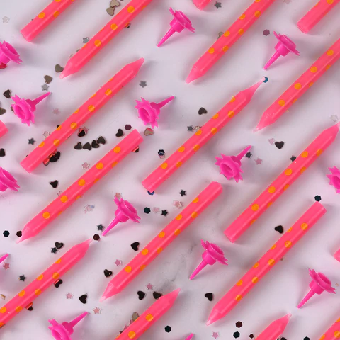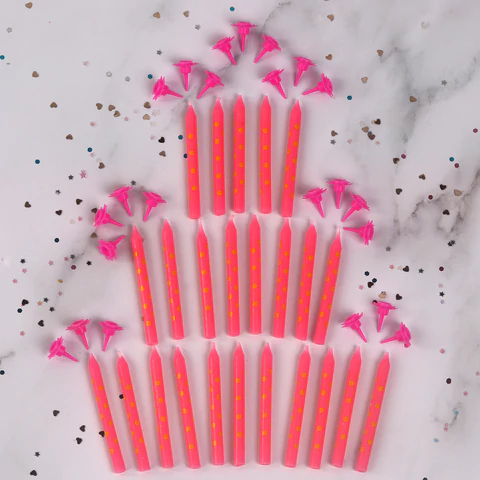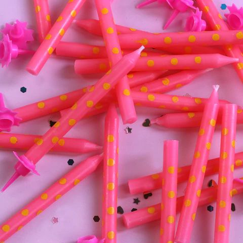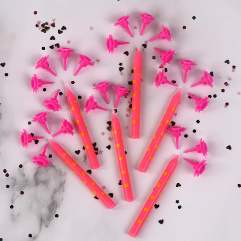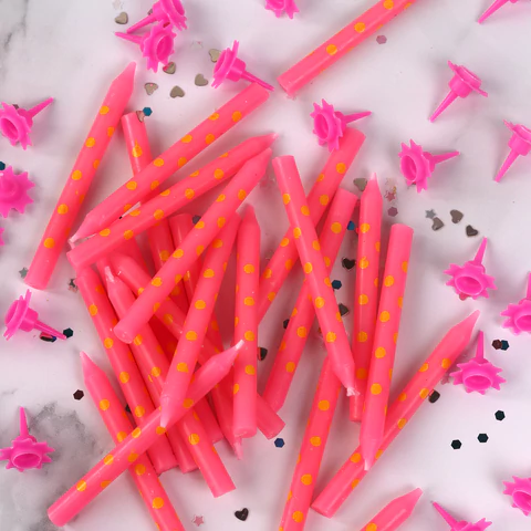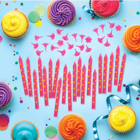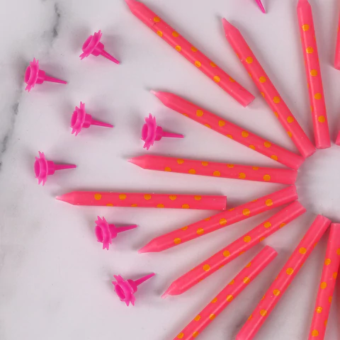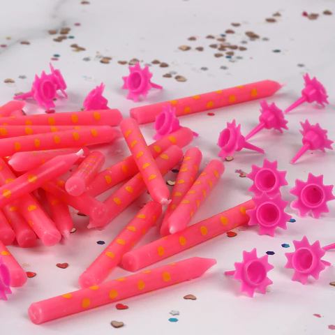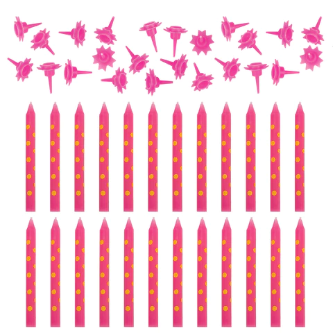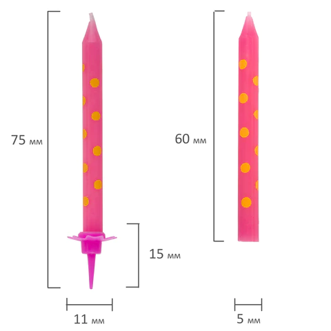 В состав набора входят 24 свечи розового цвета с принтом в виде желтого горошка. Выполнены из парафина и укомплектованы пластиковыми держателями для удобства размещения в торте или другом кондитерском изделии. Высота свечи - 6 см, толщина - 0,5 см.