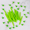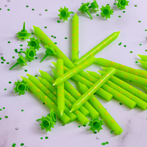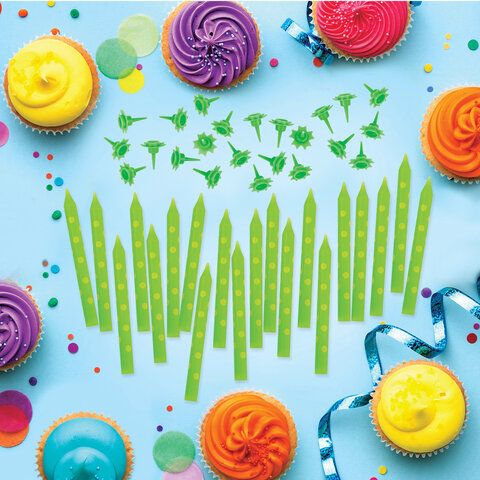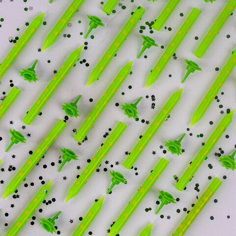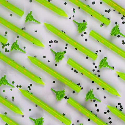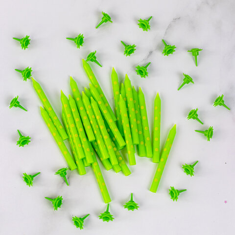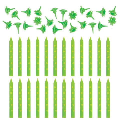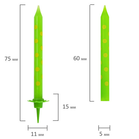 В состав набора входят 24 свечи зеленого цвета с принтом в виде желтого горошка. Выполнены из парафина и укомплектованы пластиковыми держателями для удобства размещения в торте или другом кондитерском изделии. Высота свечи - 6 см, толщина - 0,5 см.
