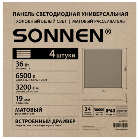 Прибор SONNEN освещает пространство со световым потоком, равным 3200 Лм, при цветовой температуре, составляющей 6500 К, благодаря чему подходит для обслуживания большого помещения. Его размеры составляют 595x19x595 мм.