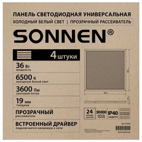 Прибор SONNEN освещает пространство со световым потоком, равным 3600 Лм, при цветовой температуре, составляющей 6500 К, благодаря чему подходит для обслуживания большого помещения. Его размеры составляют 595x19x595 мм.