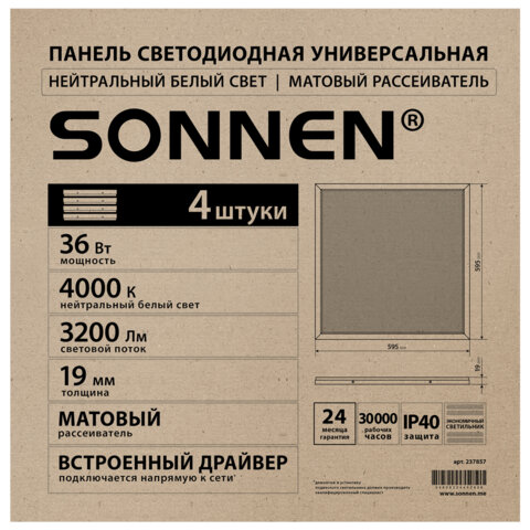 Прибор SONNEN освещает пространство со световым потоком, равным 3200 Лм, при цветовой температуре, составляющей 4000 К, благодаря чему подходит для обслуживания большого помещения. Его размеры составляют 595x19x595 мм.