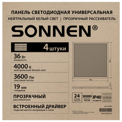 Прибор SONNEN освещает пространство со световым потоком, равным 3600 Лм, при цветовой температуре, составляющей 4000 К, благодаря чему подходит для обслуживания большого помещения. Его размеры составляют 595x19x595 мм.