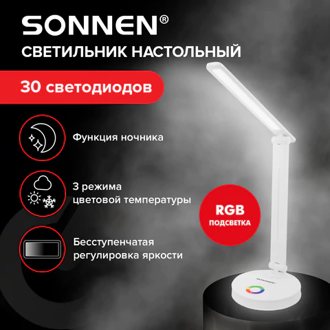 Откройте для себя многофункциональную светодиодную лампу-светильник SONNEN RG-001. Лампа обладает мощностью 6 Вт и 30 яркими диодами. Этот светильник легко создаёт комфортную атмосферу в любой комнате благодаря встроенной RGB-подсветке. Три режима цветовой температуры — тёплый, нейтральный и холодный свет — идеально подойдут как для отдыха, так и для работы, а функция ночника обеспечит мягкое, ненавязчивое освещение в ночное время. Бесступенчатая регулировка яркости позволяет точно настроить свет под свои нужды: от приглушённого свечения до яркого рабочего света.