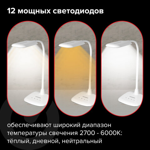 Настольная лампа-светильник высотой 31,5 см представлена в классическом белом дизайне, благодаря которому гармонично впишется в офисный или домашний интерьер. Устройство оснащено легким пластиковым корпусом и яркой LED-матрицей на 8 Вт. Вы будете довольны освещением с цветовой температурой от 2700 до 6000 K и световым потоком 350 Лм, которое обеспечивают 12 светодиодов. Прибор оснащен сенсорным выключателем. Благодаря 3 режимам свечения можно самостоятельно выбрать яркость света.