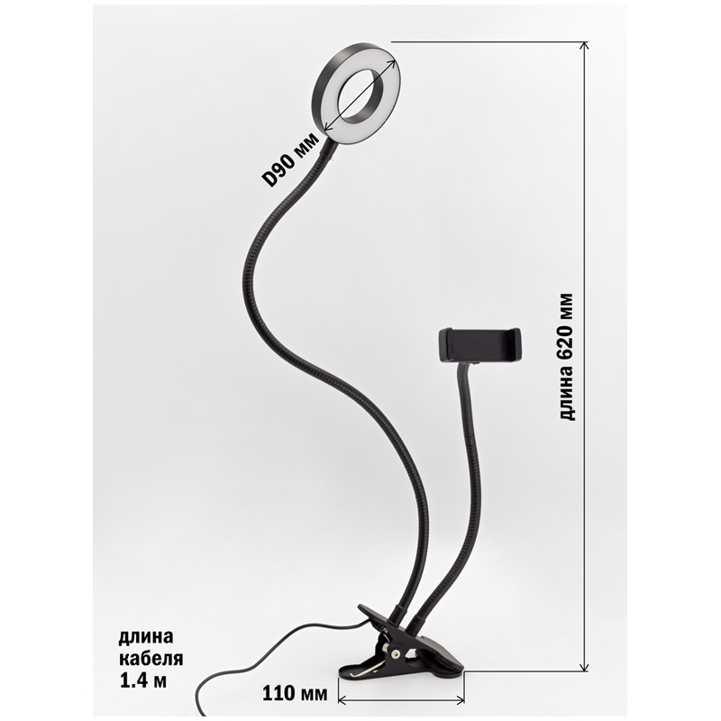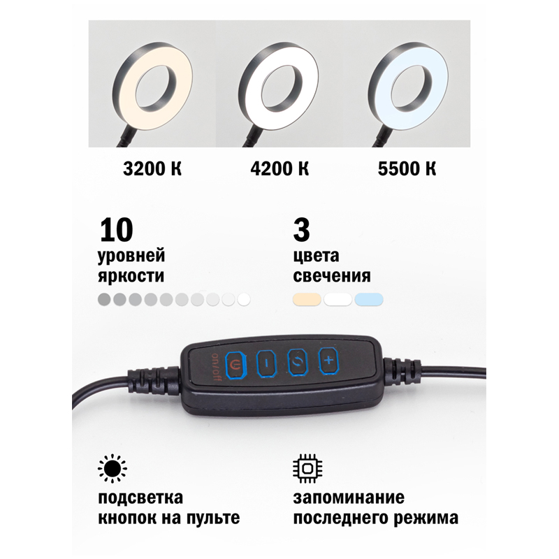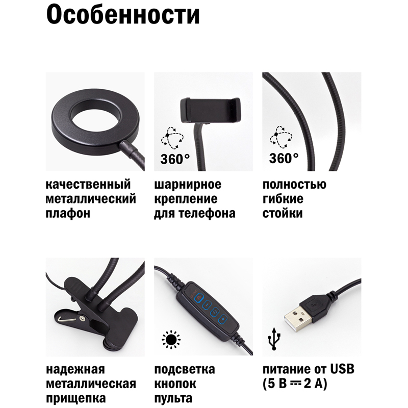 Качественный свет: настраивайте яркость и цвет свечения для достижения нужного эффекта при фото- и видеосъемке<br/>Легкость и простота конструкции: можно переносить с собой и закреплять на любой поверхности<br/>Удобство - можно подключать к USB-разъему любого устройства (адаптера/компьютера/аккумулятора)