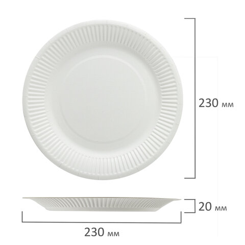 Подходят как для холодных, так и для горячих блюд (до+70 °С). Предназначены для корпоративных мероприятий любого формата, выездов на природу, пикников. Можно использовать для разогрева еды в микроволновой печи. Изготовлены из ламинированной бумаги белого цвета. Диаметр тарелок 230 мм, поставляются в комплекте 100 штук.