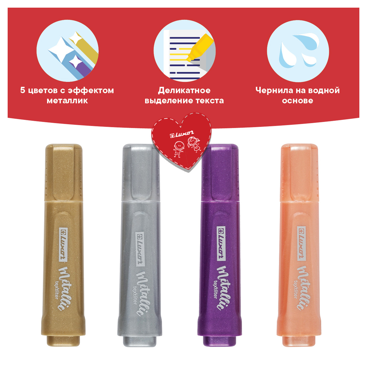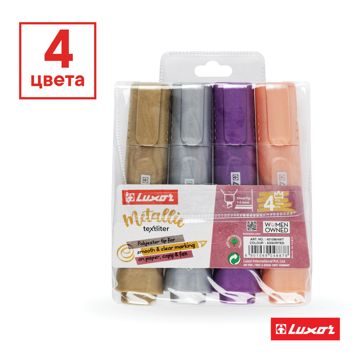 Набор текстовыделителей Luxor "Textliter Metallic - четыре маркера c эффектом металлик в одном наборе. Чернила с эффектом металлик создадут необычные переливы при письме.<br/>Текстовыделители подходят для выделения в тексте, ежедневнике, тетради. Сделает акценты на самые важные моменты.<br/>Прочный фибровый наконечник не западает в корпус и сохраняет форму на протяжении всего срока службы текстовыделителя.<br/>Текстовыделить до 5 дней не высыхает без колпачка, а при закрытом колпачке в течение 30 минут полностью восстанавливает свои свойства!<br/>Обладает светостойкими чернилами на водной основе, которые быстро высыхают и не размывают текст.<br/>Скошенный пишущий узел позволяет варьировать толщину линии письма от 1 до 5 мм.<br/>Цвета: золото, серебро, оранжевый и фиолетовый.<br/>Почувствуй лето круглый год вместе с текстовыделителями Luxor!