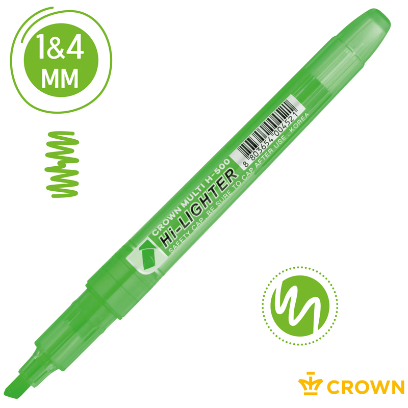 Текстовыделитель Crown "Multi Hi-Lighter". Яркий неоновый цвет подходит для выделения в тексте, ежедневнике, тетради. Сделает акценты на самые важные моменты. <br/>Прочный фибровый наконечник не западает в корпус и сохраняет форму на протяжении всего срока службы текстовыделителя. <br/>Текстовыделитель до 5 дней не высыхает без колпачка, а при закрытом колпачке в течении 30 минут полностью восстанавливает свои свойства! <br/>Обладает светостойкими чернила, которые до 5 недель не выгорают на солнце. <br/>Скошенный пишущий узел позволяет наносить линии толщиной от 1 до 4 мм. Цвет чернил - зеленый.<br/>Почувствуй лето круглый год вместе с текстовыделителями Crown!