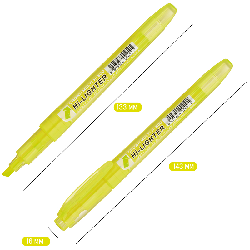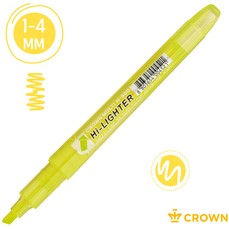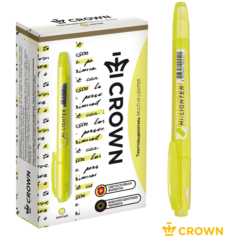 Текстовыделитель Crown "Multi Hi-Lighter". Яркий неоновый цвет подходит для выделения в тексте, ежедневнике, тетради. Сделает акценты на самые важные моменты. <br/>Прочный фибровый наконечник не западает в корпус и сохраняет форму на протяжении всего срока службы текстовыделителя. <br/>Текстовыделитель до 5 дней не высыхает без колпачка, а при закрытом колпачке в течении 30 минут полностью восстанавливает свои свойства! <br/>Обладает светостойкими чернила, которые до 5 недель не выгорают на солнце. <br/>Скошенный пишущий узел позволяет наносить линии толщиной от 1 до 4 мм. Цвет чернил - желтый.<br/>Почувствуй лето круглый год вместе с текстовыделителями Crown!