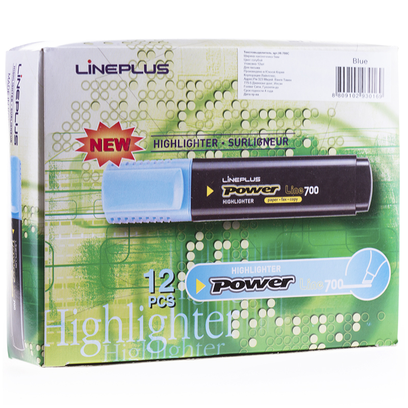 Текстовыделитель Line Plus HI-700C с увеличенным запасом чернил. Яркие неоновые цвета подходят для выделения в тексте, ежедневнике, тетради. Сделает акценты на самые важные моменты.<br/>Прочный фибровый наконечник не западает в корпус и сохраняет форму на протяжении всего срока службы маркера. <br/>Текстовыделитель до 5 дней не высыхает без колпачка, а при закрытом колпачке в течение 30 минут полностью восстанавливает свои свойства!<br/>Обладает светостойкими чернила, которые до 5 недель не выгорают на солнце.<br/>Скошенный пишущий узел позволяет наносить линии толщиной от 1 до 5 мм и не смазывать текст. Длина линии письма - 700 метров <br/>Цвет чернил - неоновый голубой. <br/>Line Plus - долговечные ультра-современные маркеры безупречного качества.